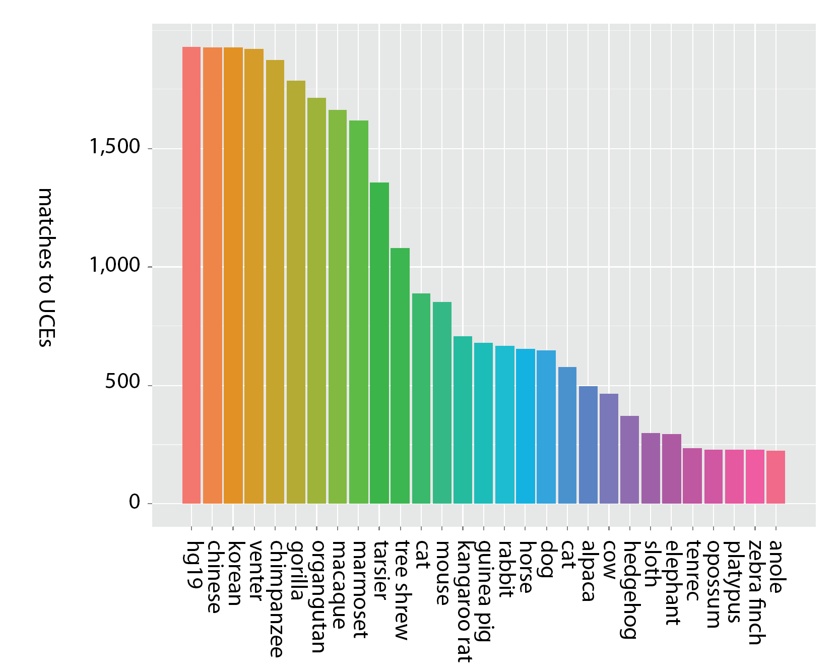 Decay in the number of unique matches across genome sequences for sequence capture probes designed from UCEs (McCormack et al. 2012). Bars moving left to right show locus counts for groups of increasing degrees of taxonomic inclusiveness and the value on the x-axis shows the final member of the set: (hg19), (hg19, chinese), (hg19, chinese, korean), (hg19, chinese, korean, venter), etc. Thus, the final taxon on the x-axis (anole) represents the number of UCE probes matching across all 29 taxa (hg19 to anole, inclusive) out of roughly 2,500 starting probes.